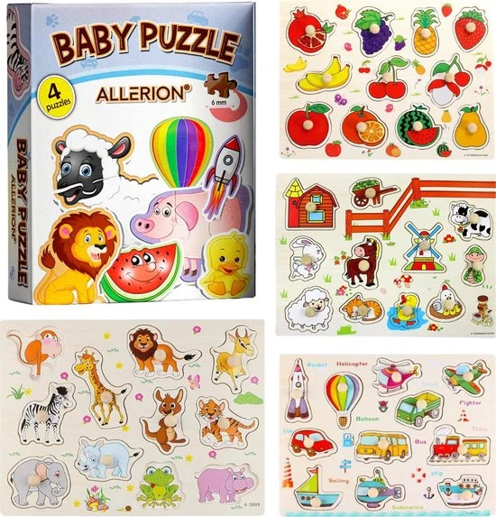 Maar liefst 4 verschillende houten puzzels bevat deze mooie set. Dat maakt dit de mest uitgebreide en meest voordelige kinder-puzzel set! Met de thema?s voertuigen, de boerderij, de dierentuin en fruit heb je heel diverse puzzels. Dit soort puzzels staan ook bekend als noppenpuzzels, knoppenpuzzels of steekpuzzels. De afbeeldingen zijn fel gekleurd, en dragen bij aan de ontwikkeling van je kind. Kun jij alle dieren en fruitsoorten opnoemen?