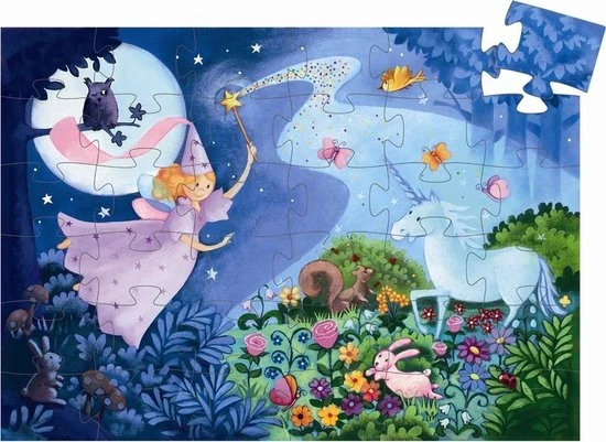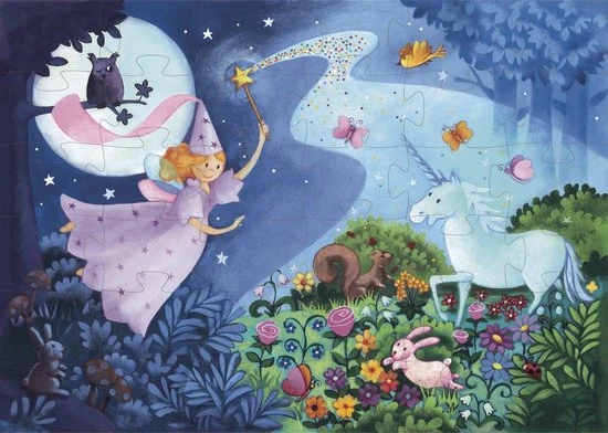 Een vrolijke, sprookjesachtige puzzel van het Franse merk Djeco. Op de puzzel staan een fee en een eenhoorn afgebeeld met allerlei dieren om zich heen.