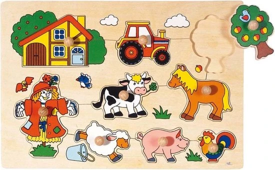 Houten noppenpuzzel met 9 puzzelstukken uit het boerderij thema. Geschikt voor de leeftijd vanaf 1 jaar.
