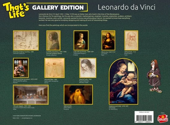 De That’s Life Gallery Edition: Leonardo da Vinci puzzel heeft afmetingen van 68x48cm indien compleet. De doos inclusief puzzel weegt 725 gram.