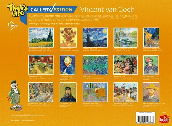 Hou jij van kunstwerken en vind jij puzzelen leuk? In deze Gallery Edition: Van Gogh Puzzel zijn een aantal kunstwerken van Vincent van Gogh verwerkt. De legpuzzel bestaat uit wel 1000 stukjes en zorgt voor urenlang plezier. De prachtige kunstwerken van de kunstenaar Vincent van Gogh verschijnen als je de puzzel af hebt. Superleuk voor zowel jong en oud!