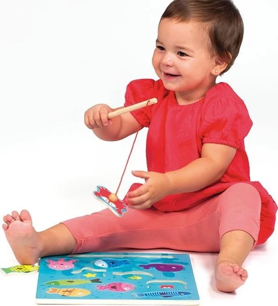 Goula Magneet Puzzel Vissen is een houten puzzel waarbij de puzzelstukken worden opgevist met een magnetische hengel. Elk puzzelstuk correspondeert met een vorm en de illustraties van de vis is ook getekend in de vorm. Helpt bij de ontwikkeling van precisie en het concentratievermogen. De illustraties zijn helder en kleurrijk.