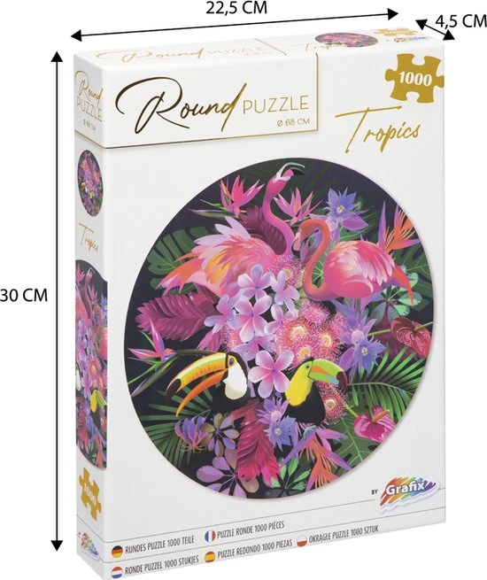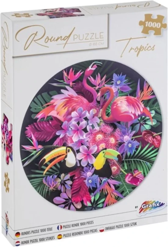 Anders dan de traditionele rechthoekige puzzel, is de ronde Tropische puzzel van Grafix. De puzzelstukjes zijn erg goed gesneden waardoor de puzzelstukjes mooi in elkaar passen. Daarnaast zijn de puzzelstukjes ”Premium Pigment” bedrukt en glad oppervlak, waardoor de puzzel een prachtig kleureffect heeft.