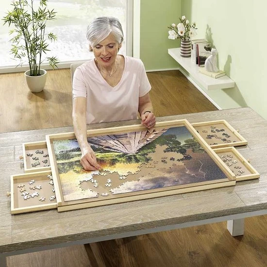 De puzzelplaat met lades draagt bij aan het ervaren van meer puzzelplezier. De laatste zorg die je nog hebt, of je op tijd klaar bent, wordt ermee weggenomen. Dankzij de plaat en de lades is een puzzel namelijk altijd gemakkelijk op te ruimen. Ook wanneer deze nog niet compleet gelegd is. Je kunt er dan op een ander moment aan verder gaan. Zonder dat je ruimte in huis in beslag blijft nemen. Dat draagt bij aan een ontspannen puzzelervaring.