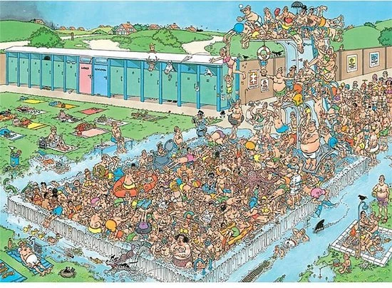 Het is een warme zomerdag en iedereen zoekt verkoeling en ontspanning in het buitenbad. Het zwembad is inmiddels bomvol! Kan jij alle bekende Jan van Haasteren familieleden nog terug vinden?