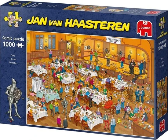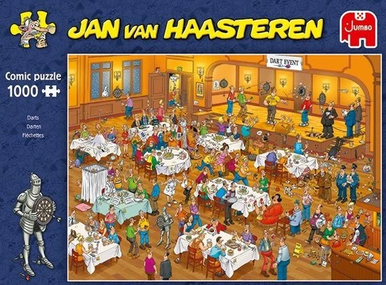 Jan van Haasteren Darts met 1000 stukjes is een puzzel van tekenaar Jan van Haasteren. Tijdens dit Dart toernooi verloopt niet alles even soepel. Zodra je Jan van Haasteren puzzels begint te puzzelen stuit je op het ene na het andere hilarische tafereel. Jan van Haasteren heeft ook deze keer weer laten zien dat humor op een prachtige manier kan worden verwerkt in een puzzel.