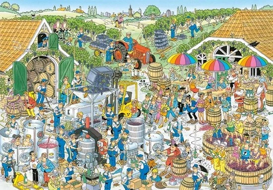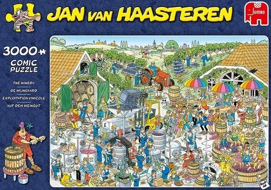 Jan van Haasteren 3000 stukjes De Wijnmakerij, Legpuzzel. Jan van Haasteren heeft ook deze keer weer laten zien dat humor op een prachtige manier kan worden verwerkt in een puzzel. Jan van Haasteren puzzels zijn puzzels met veel kleur en details. Jan van Haasteren tekent al decennia lang humoristische platen die je steeds weer verrassen en laten lachen. De echte fans kennen de specifieke kenmerken van Jan van Haasteren en zoeken in elke puzzel direct naar de haaienvin, Sinterklaas, de handjes, het kunstgebit en Jan?s zelfportret. Jumbo heeft tientallen Jan van Haasteren puzzels in de collectie van 54 tot maar liefst 5.000 puzzelstukjes.
