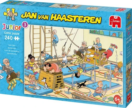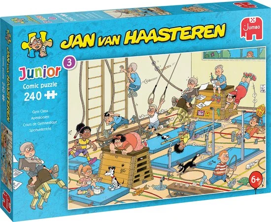 Het is een chaotische gymles in de Jan van Haasteren Junior Apenkooien kinderpuzzel van 240 puzzelstukjes.