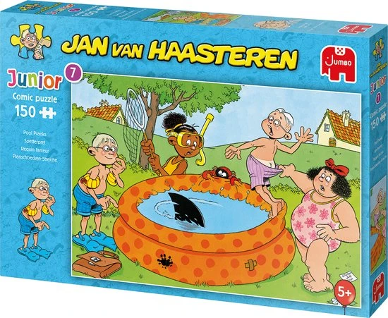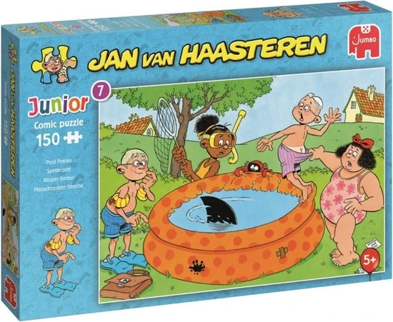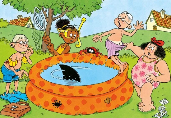 Het is een warme dag en de Jan van Haasteren vriendjes willen een duik nemen in het zwembadje in de tuin. Plots zien ze een haaienvin in het water! Is dat wel echt? Of is het Jan die een grap met ze uithaalt? Deze humoristische puzzel van 150 stukjes is geschikt voor kinderen vanaf 5 jaar.