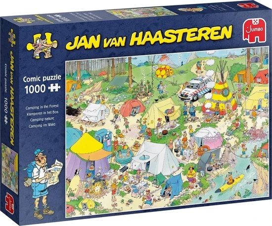 Jan van Haasteren Kamperen in het Bos met 1000 Stukjes is een van de nieuwe puzzels van Jan van Haasteren. Tijdens het kamperen verloopt niet alles even soepel. Kamperen in het Bos van Jan van Haasteren is een puzzel met 1000 stukjes voor de echte Jan van Haasteren fans! Zodra je Jan van Haasteren Kamperen in het Bos met 1000 Stukjes begint te puzzelen stuit je op het ene na het andere hilarische tafereel. Jan van Haasteren heeft ook deze keer weer laten zien dat humor op een prachtige manier kan worden verwerkt in een puzzel. Jan van Haasteren puzzels zijn puzzels met veel kleur en details. Jan van Haasteren tekent al decennia lang humoristische platen die je steeds weer verrassen en laten lachen. De echte fans kennen de specifieke kenmerken van Jan van Haasteren en zoeken in elke puzzel direct naar de haaienvin, Sinterklaas, de handjes, het kunstgebit en Jan?s zelfportret. Jumbo heeft tientallen Jan van Haasteren puzzels in de collectie van 54 tot maar liefst 5.000 puzzelstukjes.
