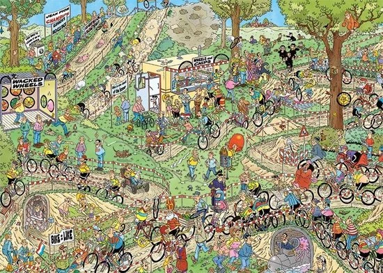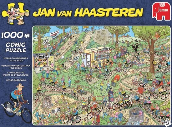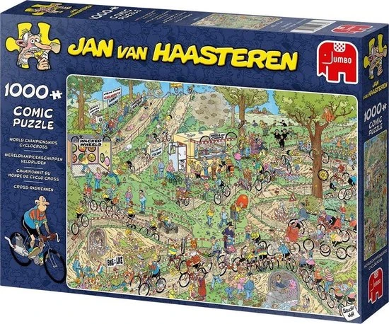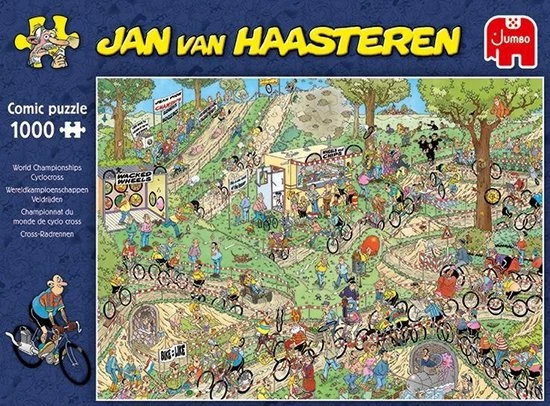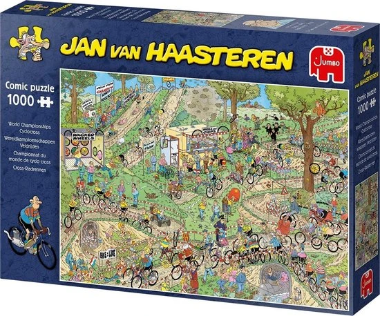 Jan van Haasteren Wereldkampioenschappen Veldrijden Legpuzzel 1000 Stukjes is weer een parel van Jan van Haasteren. Tijdens het Wereldkampioenschappen Veldrijden verloopt niet alles even soepel. Jan van Haasteren Wereldkampioenschappen Veldrijden Legpuzzel 1000 Stukjes stukjes voor de echte Jan van Haasteren fans! Zodra je Jan van Haasteren Wereldkampioenschappen Veldrijden Legpuzzel 1000 Stukjes begint te puzzelen stuit je op het ene na het andere hilarische tafereel. Jan van Haasteren heeft ook deze keer weer laten zien dat humor op een prachtige manier kan worden verwerkt in een puzzel. Jan van Haasteren puzzels zijn puzzels met veel kleur en details. Jan van Haasteren tekent al decennia lang humoristische platen die je steeds weer verrassen en laten lachen. De echte fans kennen de specifieke kenmerken van Jan van Haasteren en zoeken in elke puzzel direct naar de haaienvin, Sinterklaas, de handjes, het kunstgebit en Jan?s zelfportret. Jumbo heeft tientallen Jan van Haasteren puzzels in de collectie van 54 tot maar liefst 5.000 puzzelstukjes.