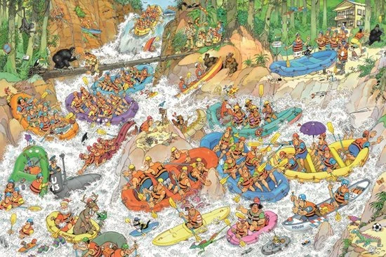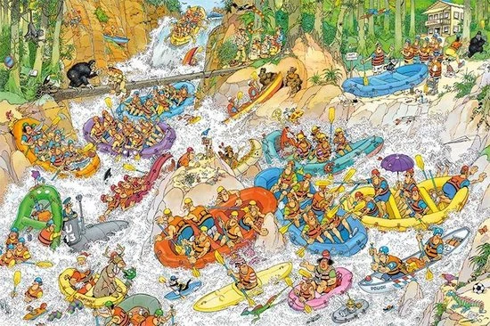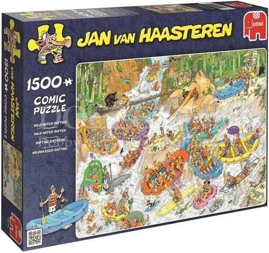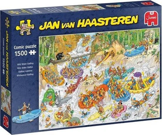 Ga je mee Wild Water Raften in de bossen? Met deze puzzel neemt Jan van Haasteren je mee in een bootje de rivier af. Wat kan er allemaal mis gaan? Een heleboel! Veel plezier met de nieuwste puzzel van Jan van Haasteren. Wild Water Raften is verkrijgbaar in 1500 en in 3000 stukjes.