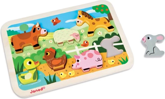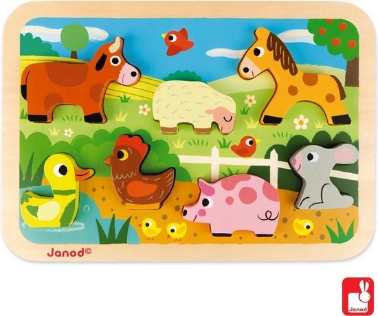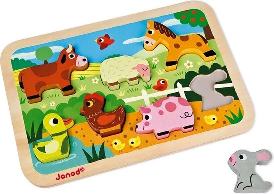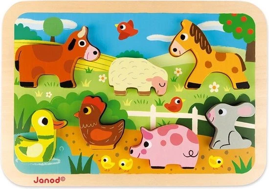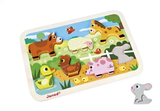 Chunky puzzel boerderij. Puzzelstukjes die te herkennen zijn aan de vorm en aan de kleur op de puzzel als je het puzzelstukje er uit haalt. Kleur- en vormherkenning! Geschikt voor kinderen vanaf 18 maanden.