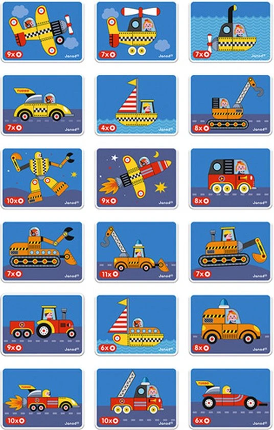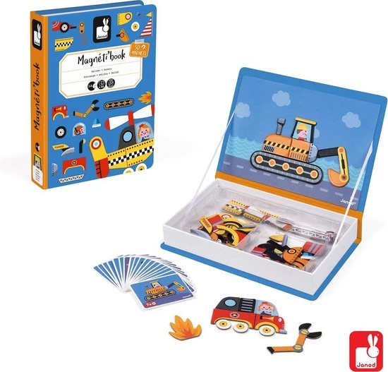 Educatief magneetspel van karton met voertuigen als thema. Bevat 50 magneten en 18 kaarten. Open het boek en maak hetzelfde voertuig als deze die op de kaart is aangegeven met behulp van de magneten.