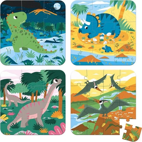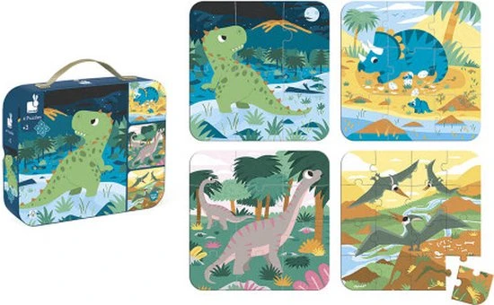 4 kartonnen puzzels van 6, 9, 12 en 16 stukjes met dinosaurussen als thema. Wordt verkocht in een mooie geschenkdoos met stoffen handvat.