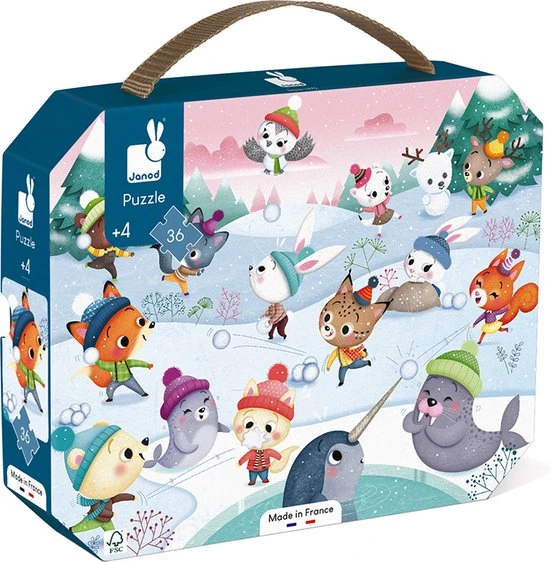 Kartonnen puzzel van 36 stukjes met een dieren sneeuwballengevecht als thema. Poster inbegrepen. Wordt verkocht in een mooie geschenkdoos met een stoffen handvat. Afmeting puzzel: 50×40 cm. Geschikt voor kinderen vanaf 4 jaar.