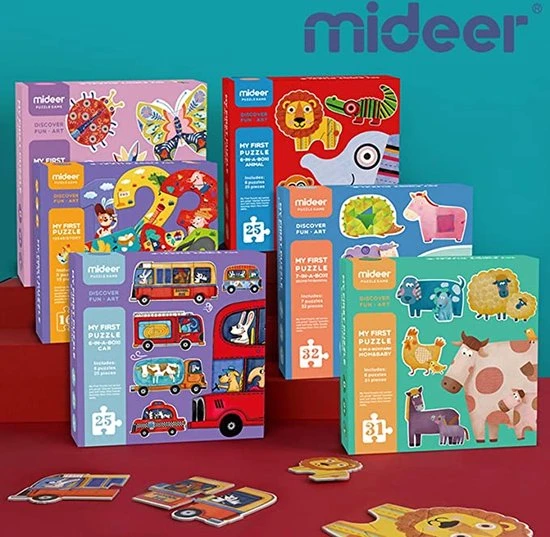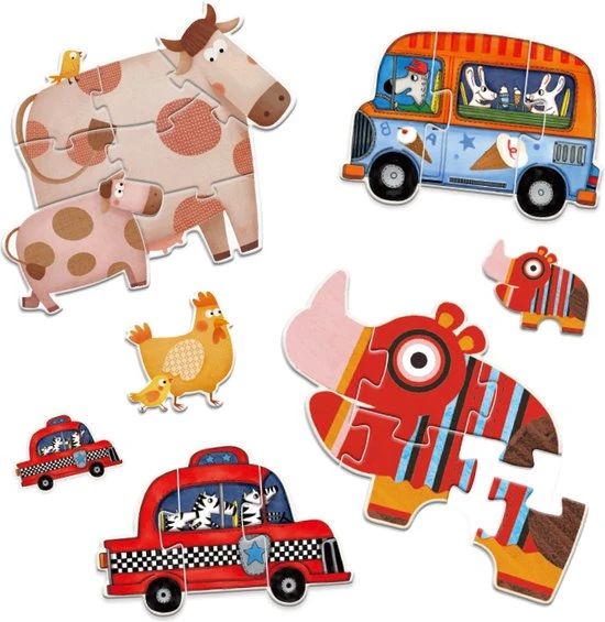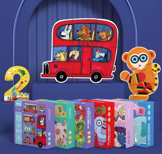 MIJN EERSTE PUZZLE: Lijndieren (6 dieren puzzels), Tuindieren (6 dieren puzzels), Auto Familie (5 auto puzzels). De My First puzzels worden geleverd in een stevige vierkante doos.