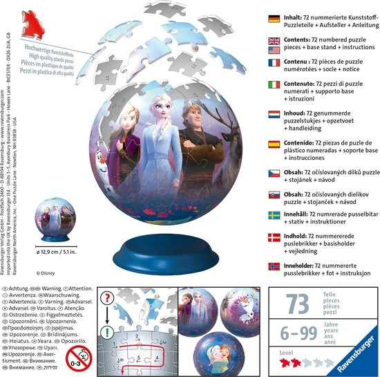 Elsa, Anna en hun vrienden beginnen aan nieuwe avonturen met deze 3D-puzzelbal! Een stabiele bal wordt gemaakt van gebogen plastic puzzelstukjes, zonder lijm. De nummering op de achterkant maakt voorsortering en puzzels op nummer mogelijk. Dankzij onze Easyclick-technologie passen alle onderdelen perfect in elkaar – voor uniek puzzelplezier tot en met het laatste deel.