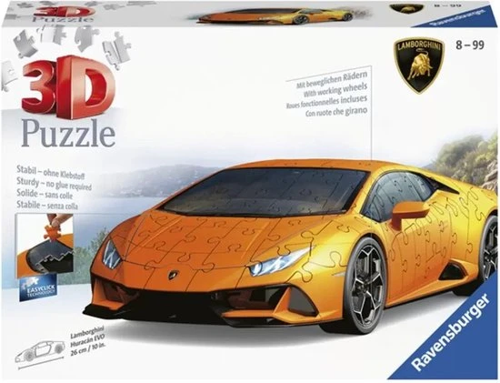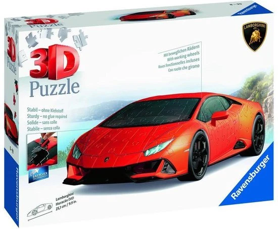 Uniek drie dimensionaal puzzelplezier, dat zijn de 3D gebouwen puzzels van Ravensburger! Puzzel prachtige 3D voertuigen en bouwwerken in elkaar en geef ze een mooi plaatsje op o. a. je wandplank of op het dressoir! De stevige plastic stukjes passen precies in elkaar. Zo bouw je vanuit gebogen, platte en opvouwbare stukjes een uniek model van de Lamborghini Hurac?n EVO, zonder lijm te gebruiken!