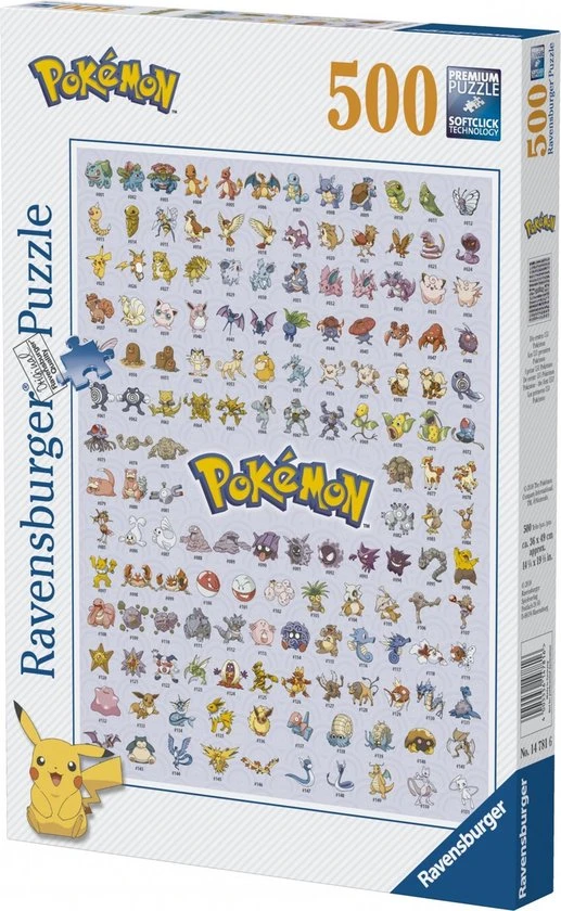 Ontsnap uit de realiteit en stap in de wereld van Ravensburger puzzels. Deze Ravensburger puzzel van 500 stukjes is de perfecte eerste stap naar de wereld van de grote puzzels. Ideaal ook voor puzzelaars die alleen op zoek zijn naar een puzzel voor tussendoor. Dankzij de met de hand gemaakte stansmessen is de vormvariatie van de stukjes oneindig. Jong en oud zullen genieten van deze Eerste generatie Pok?mon puzzel met 500 stukjes.