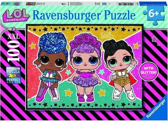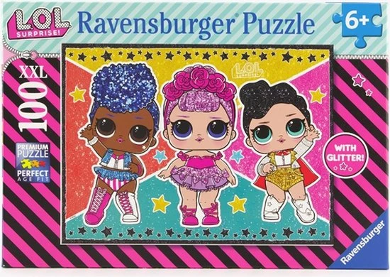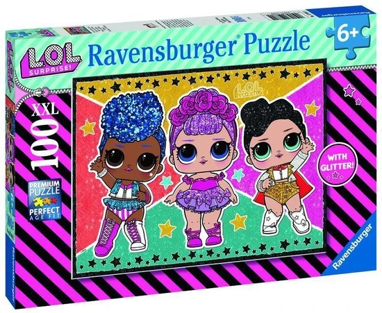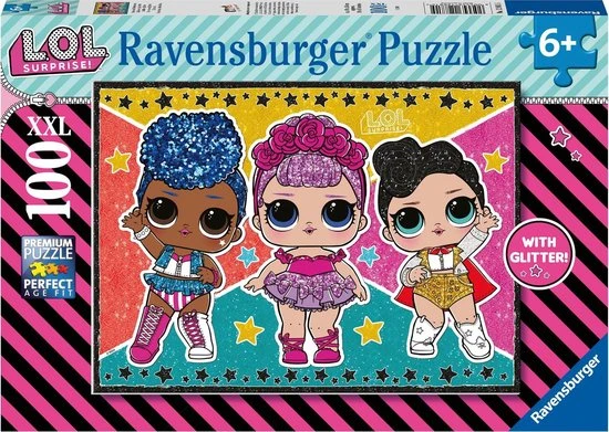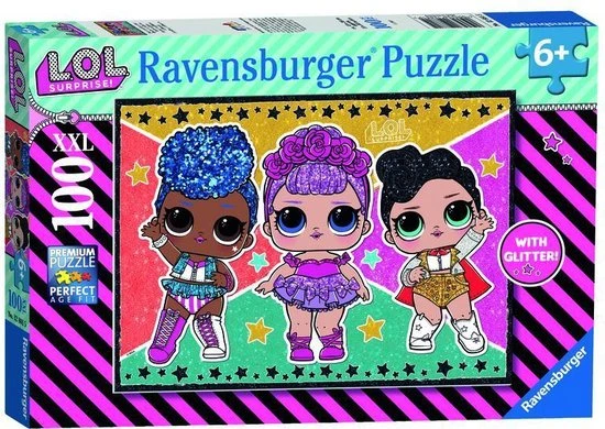 Ontsnap uit de realiteit en stap in de wereld van Ravensburger puzzels. Tijdens het puzzelen ontdekken kinderen hun grootse vaardigheden. XXL- puzzels voor XXL- puzzelplezier. De XXL-grote puzzelstukken zijn eenvoudiger te leggen. Het resultaat is een kunstwerk op posterformaat dat in geen enkele kinderkamer misstaat. Dankzij de met de hand gemaakte stansmessen is de vormvariatie van de stukjes oneindig. Kinderen vanaf 6 jaar zullen genieten van de L.O.L. Suprise puzzel met 100 stukjes met als thema L.O.L. Suprise.