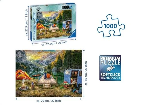 Ontsnap uit de realiteit en stap in de wereld van Ravensburger-puzzels. Deze Ravensburger puzzel van 1000 stukjes is geschikt voor zowel beginnende als ervaren puzzelaars. En omdat onze geliefde puzzels een standaard formaat hebben, kun je het resultaat inlijsten en ophangen. Dankzij de met de hand gemaakte stansmessen is de vormvariatie van de stukjes oneindig. Jong en oud zullen genieten van deze Calm Campside puzzel met 1000 stukjes.