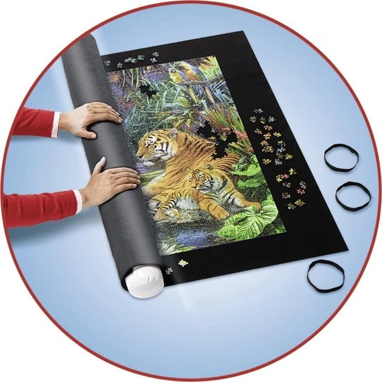 - Maak de rol vast met de bijgesloten elastiekjes. Door het slipbestendige vilt blijven alle puzzelstukjes op hun plaats.